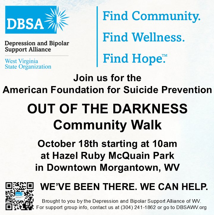 The American Foundation for Suicide Prevention of West Virginia held their annual #OutoftheDarkness Walk on October 18 at Hazel Ruby McQuain Park in Morgantown. Chapter President Libby Shuttleworth, Administrative Assistant Roger Neptune, and event volunteer Channon Humphrey were there representing DBSA WV and providing resources to the community.