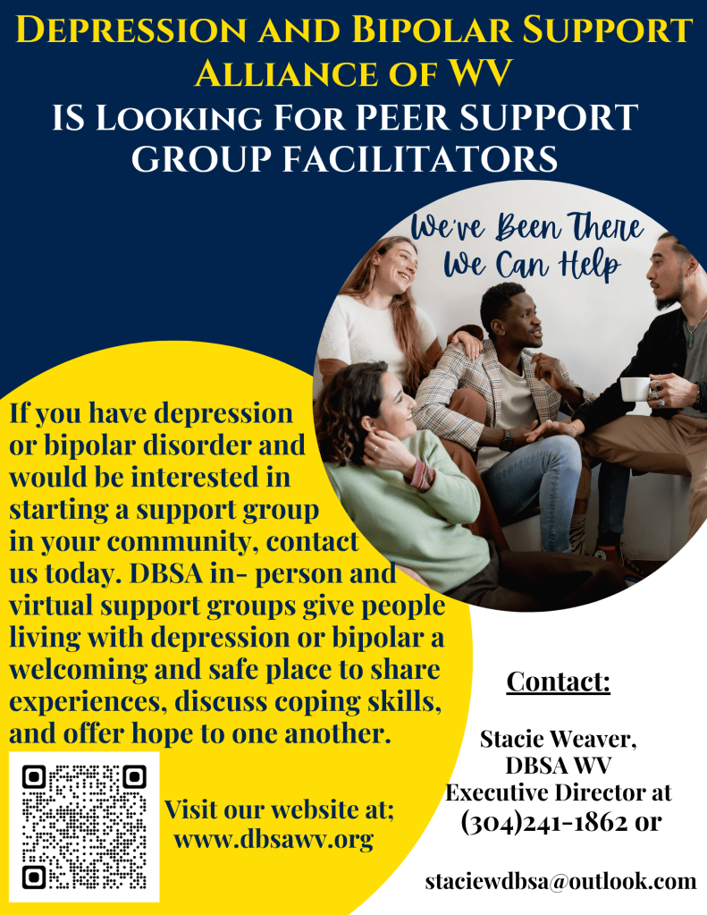 - Free literature (including new brochures on Bipolar, Depression, Anxiety, PTSD, Sleep Issues, and the “Baby Blues”) at our DBSA WV office or by visiting us out at events (see our social media posts)