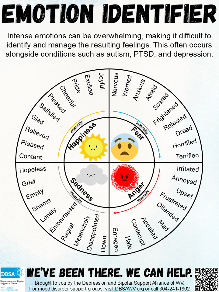 Anxiety Trap | Calling for Help (new) | Calming Techniques | Challenge: 31 Days | DBSA Mood Crew | Deep Breathing: Box | Depression Struggles | Emotion Identifier (new) | Grounding: 54321 | Holiday Stress | Lets Talk Suicide | Meditation: Leaves On A Stream | Mental Health Check-In | Mental Health Screening | Mental Health Support Groups | Mood Disorder Support Groups (new) | Perinatal Mental Health | Seasonal Affective Disorder | To The Person Who… (new) | Volunteers Wanted | What is DBSA WV? | Yoga Poses | You Are Not Alone |